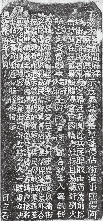 清道光20年(1840)6月,臺灣南路下淡水營都司及下淡水縣丞為兵民搭蓋草蓬侵佔街道事立碑嚴禁。碑文記載其時阿緱街(今之屏東市)官方開通之道路紛為兵、民所私佔,致轎馬難行,且治安紊亂;而由官方訂定各舖戶將簷前遮陽定三尺闊,草蓬全拆,糞堆盡除,以清街道、通水勢、利商民,又採相鄰店鋪互為保結,以達治理貫徹。